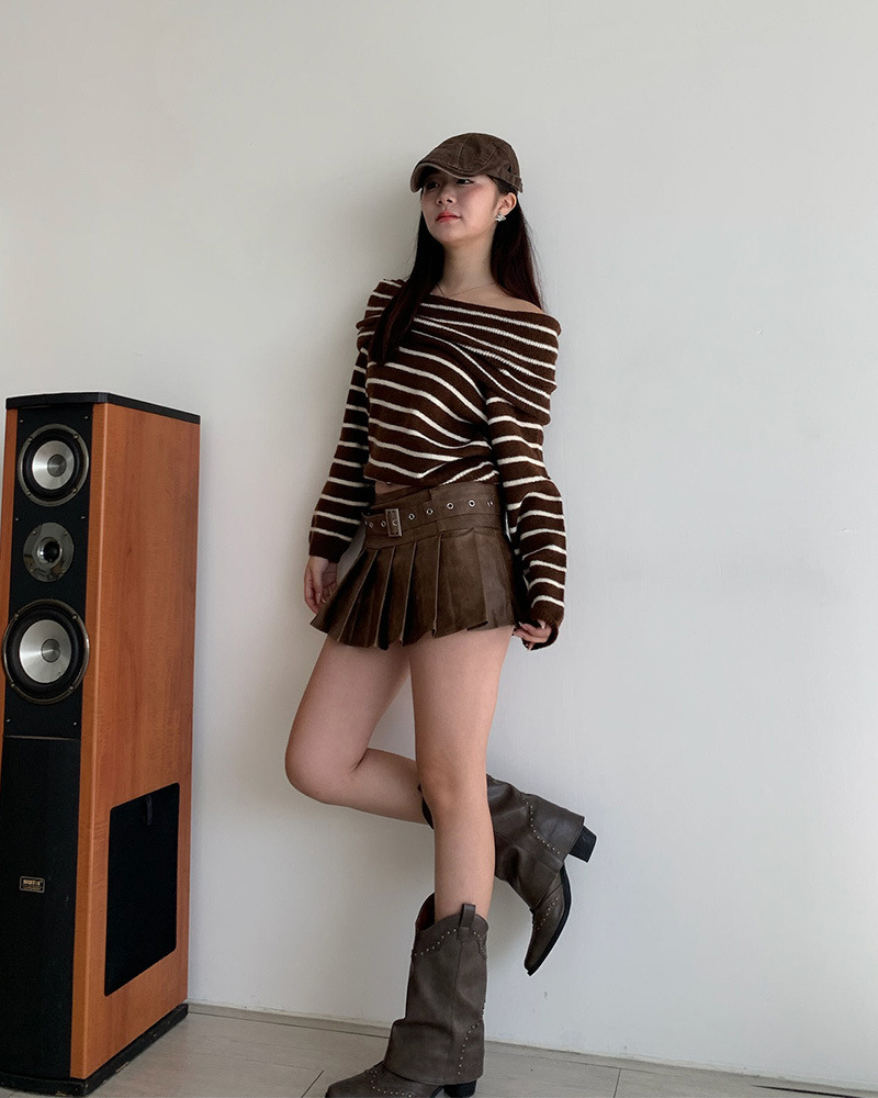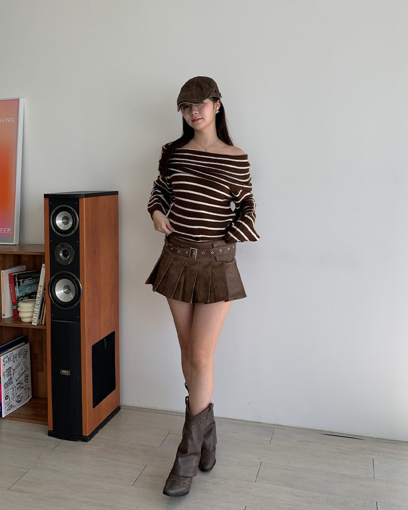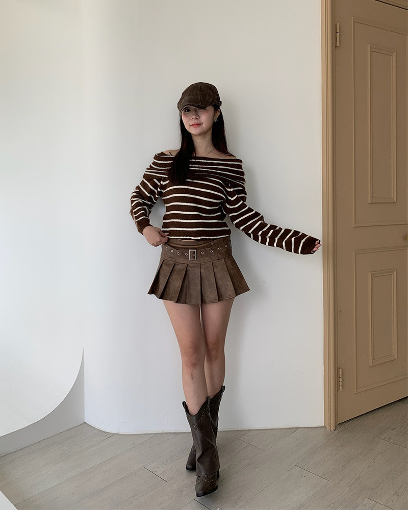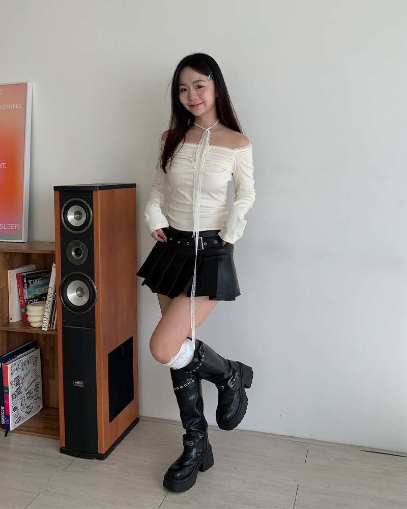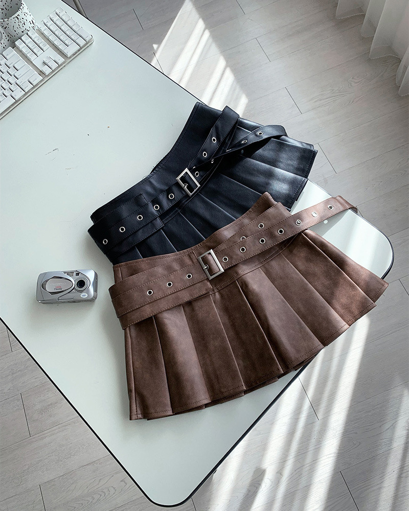 皮質光澤感加上百褶剪裁 根本是學院風和搖滾風的完美結合 金屬風皮帶也是甜辣風少女必備₊˚⊹ᰔ 俐落版型超級遮肉顯腿細.ᐟ.ᐟ 版型偏小要拿大一號呦