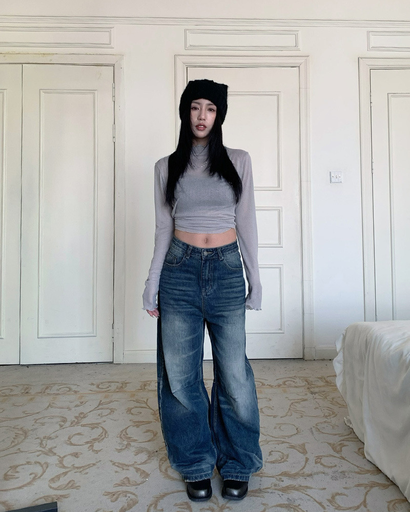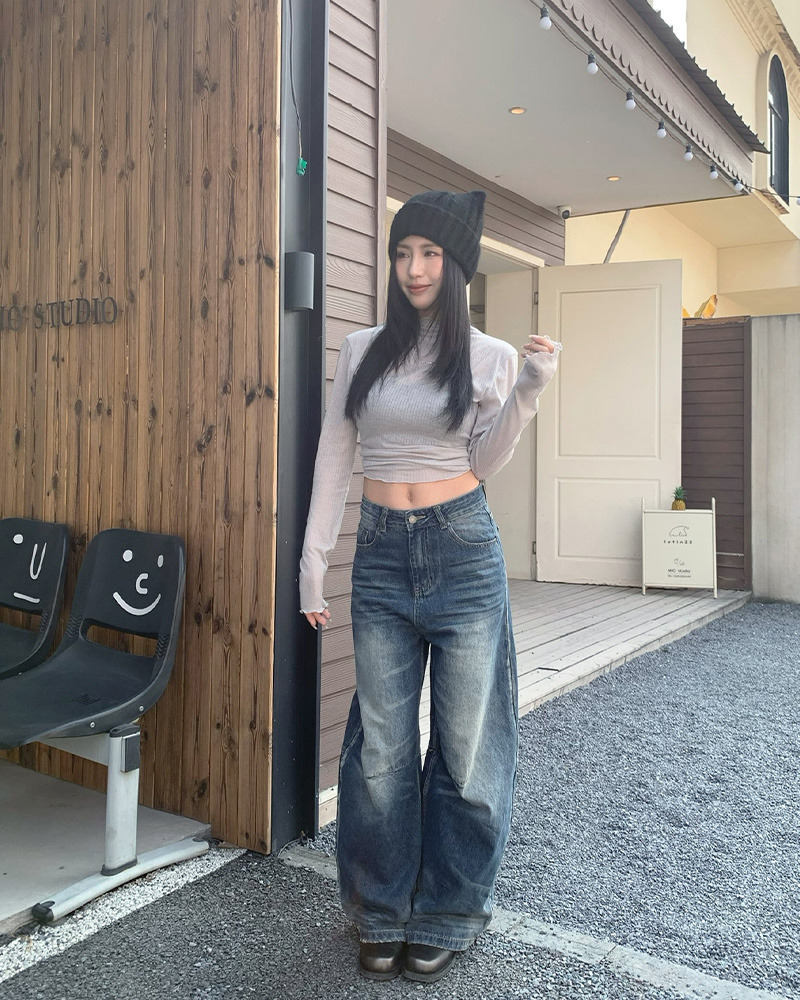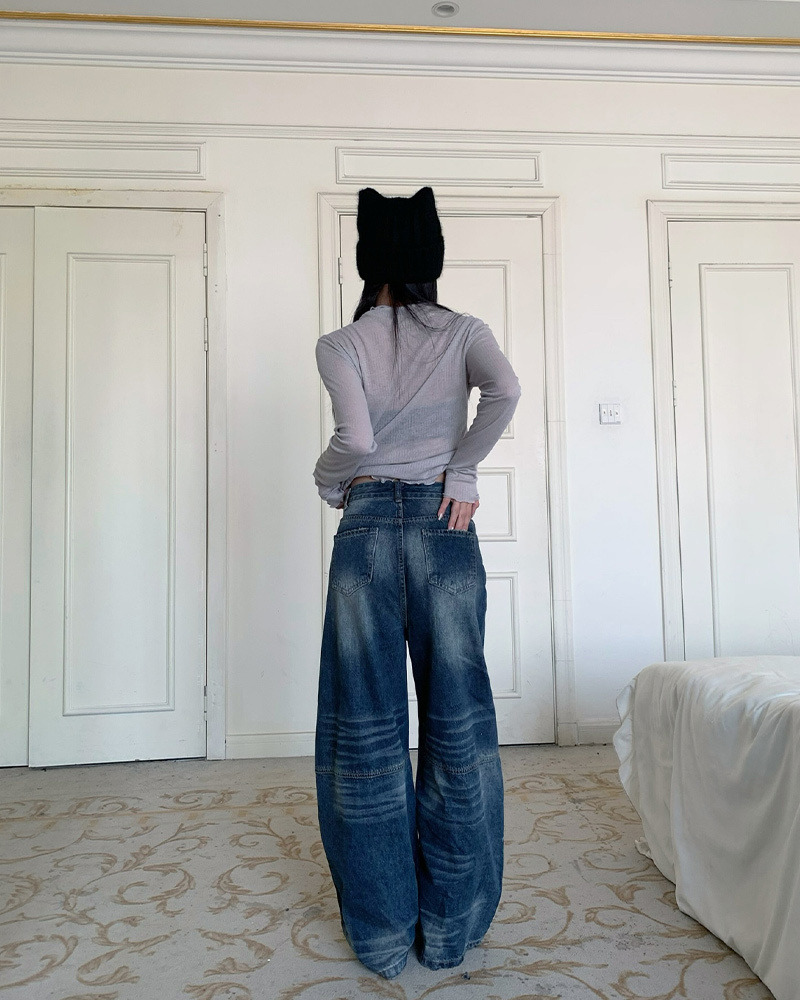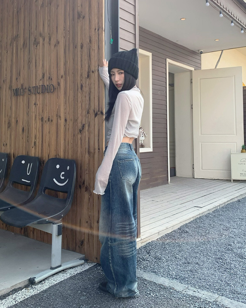 兩側褲管直線條刷白設計 落地感寬版牛仔褲型