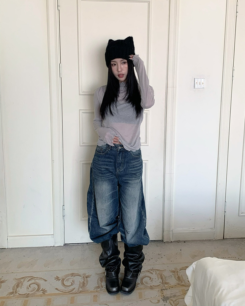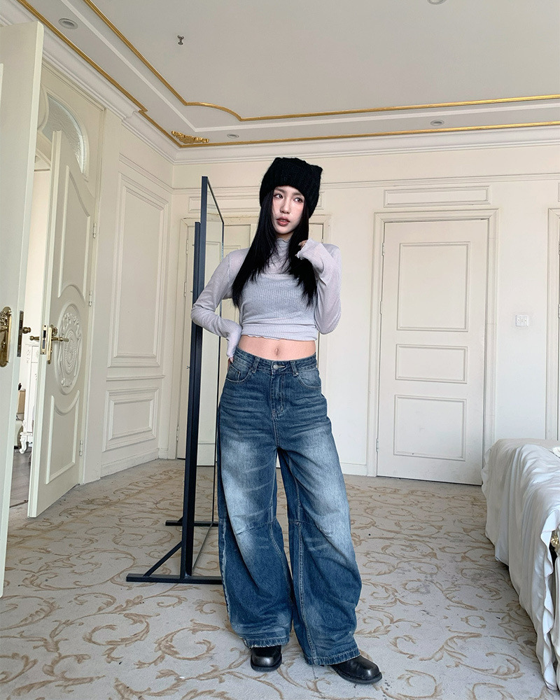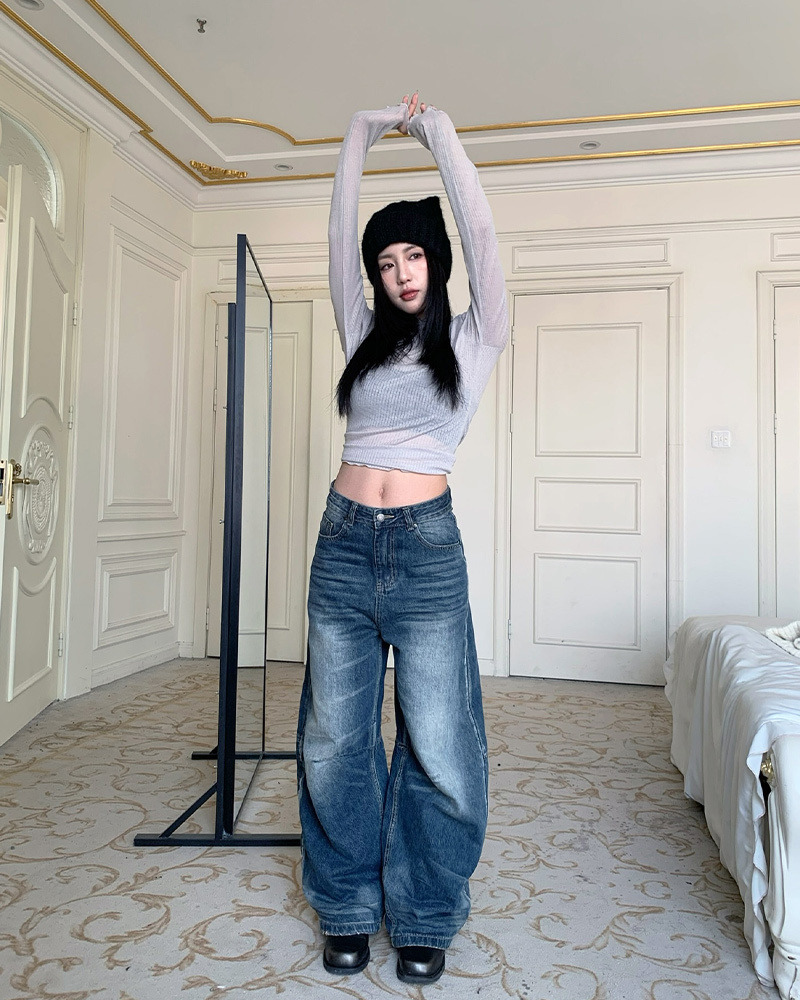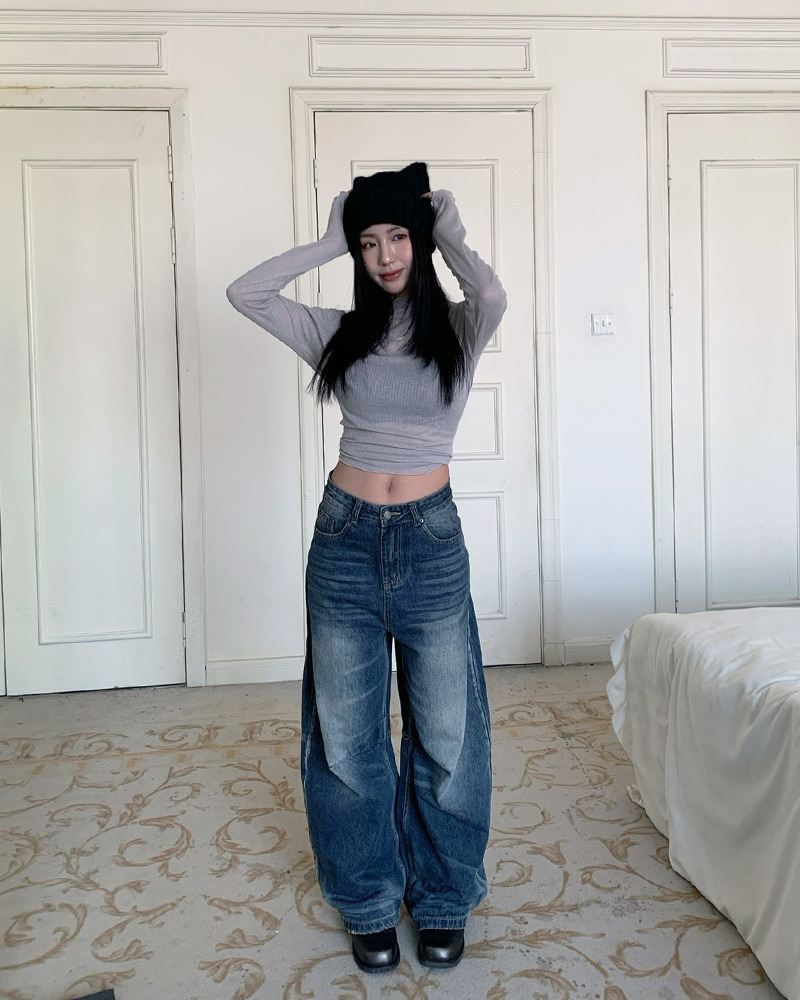 兩側褲管直線條刷白設計 落地感寬版牛仔褲型