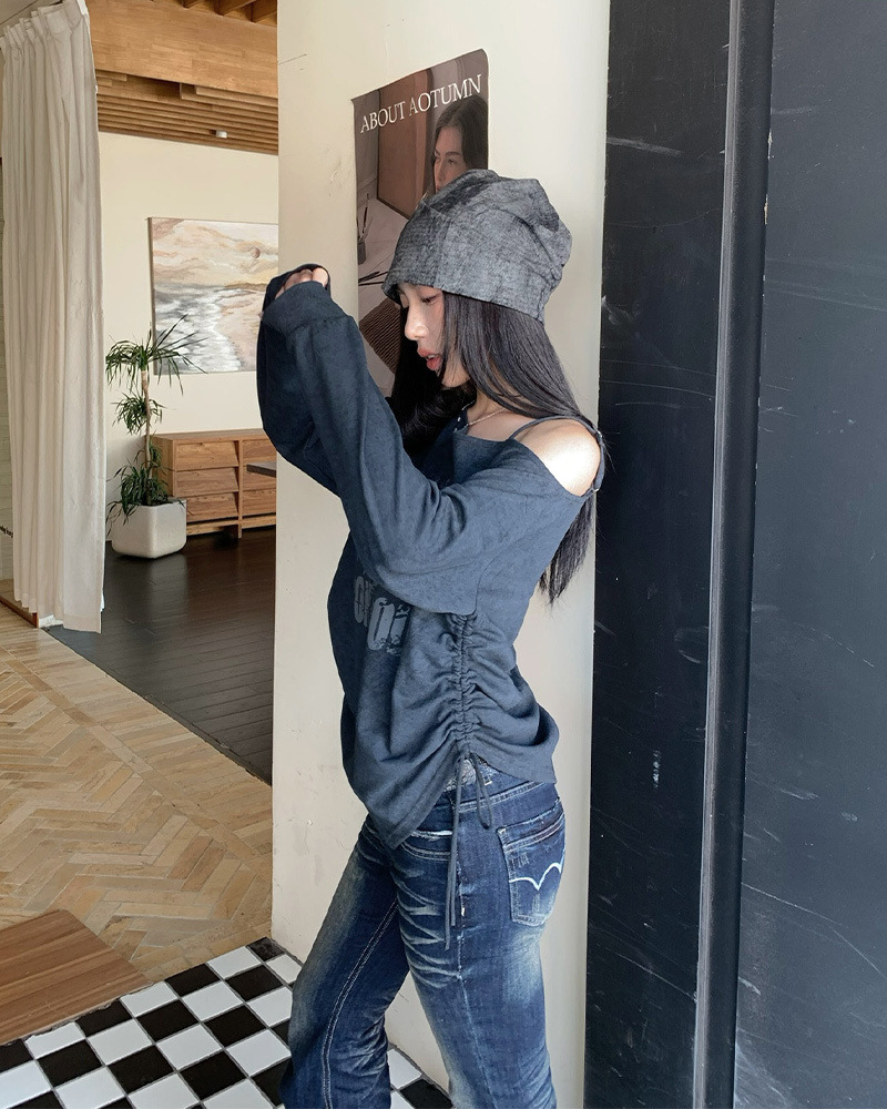 斜肩+可調肩帶 側邊抽繩抓皺