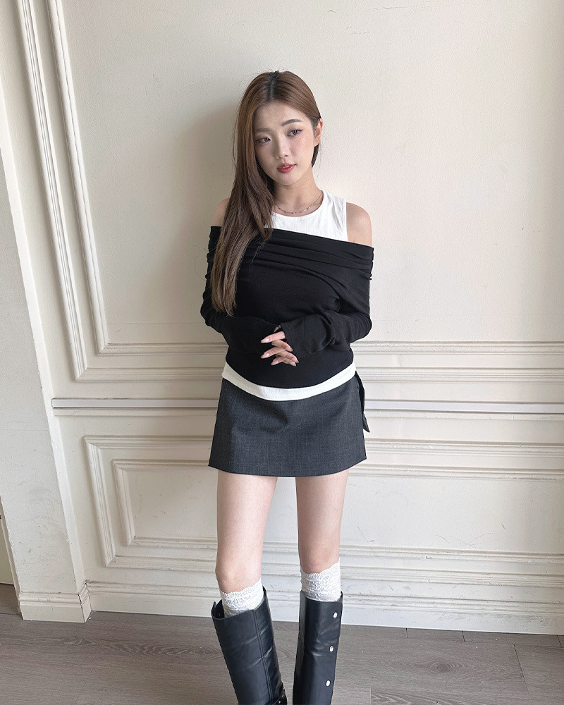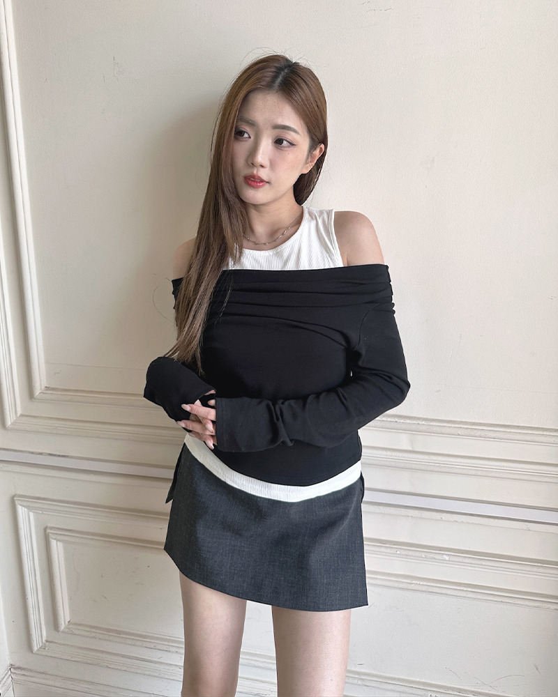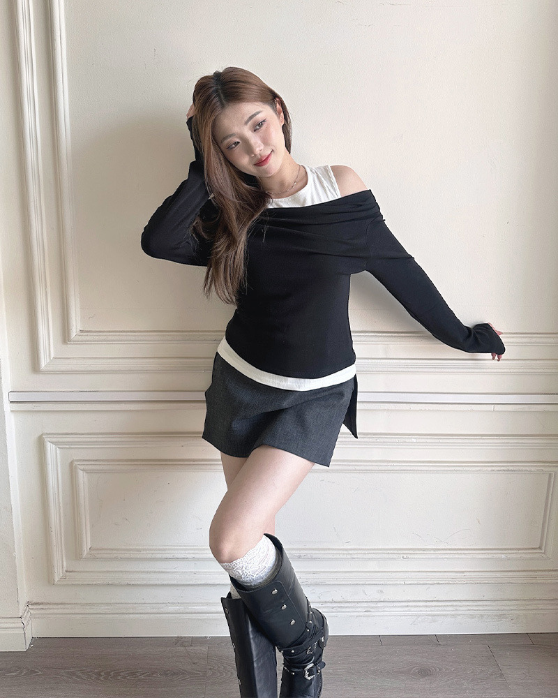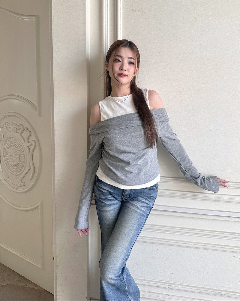 PURPLE-純粹白灰 韓系假兩件一字領上衣*2色