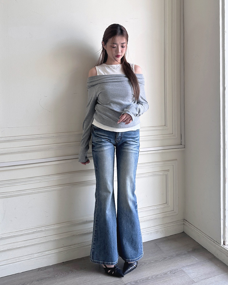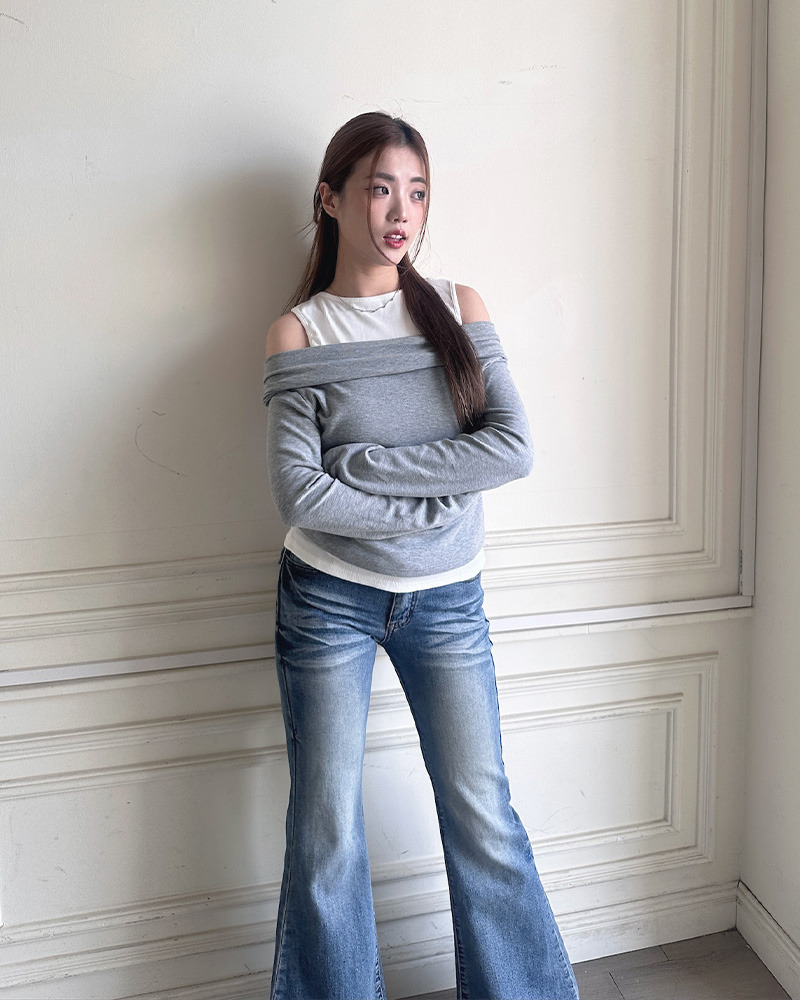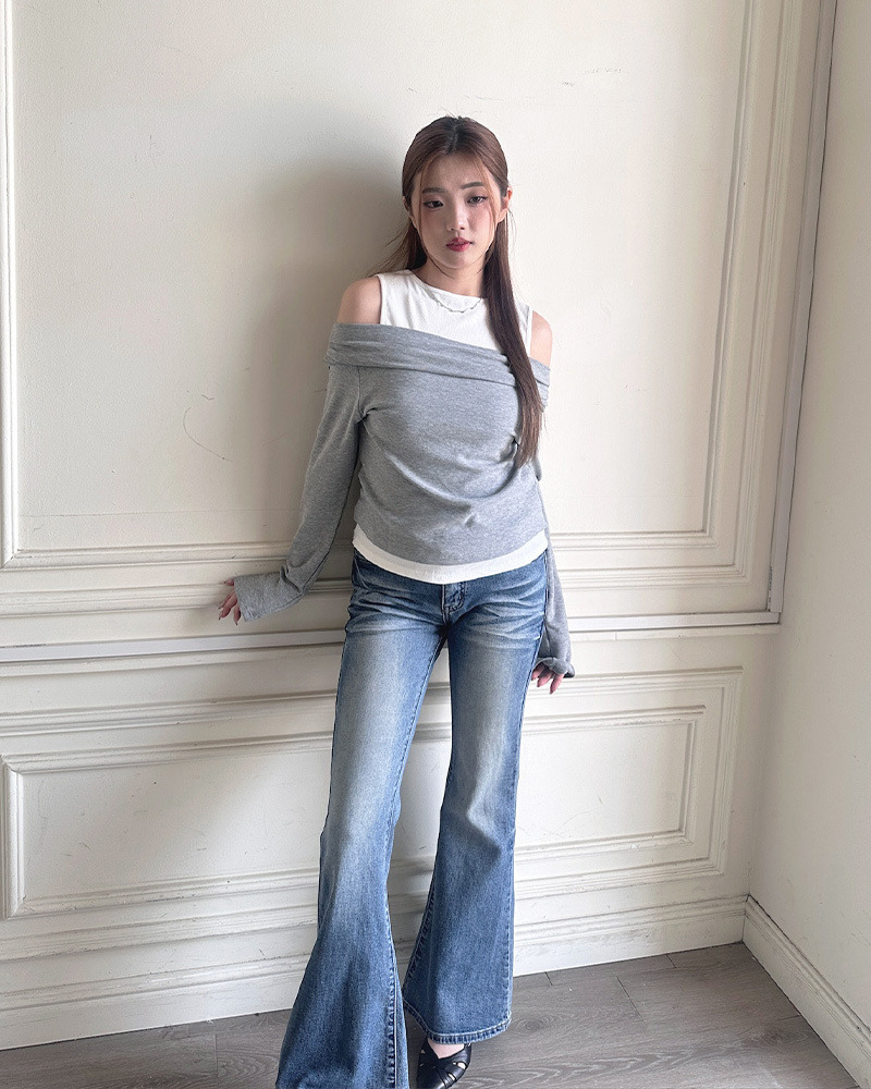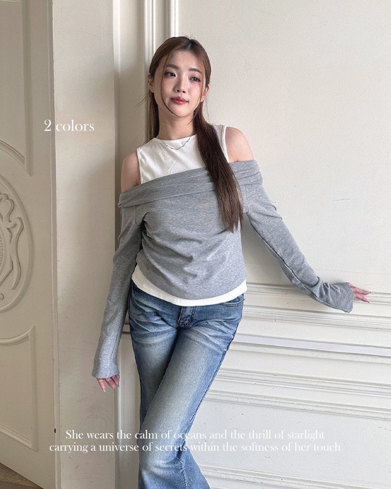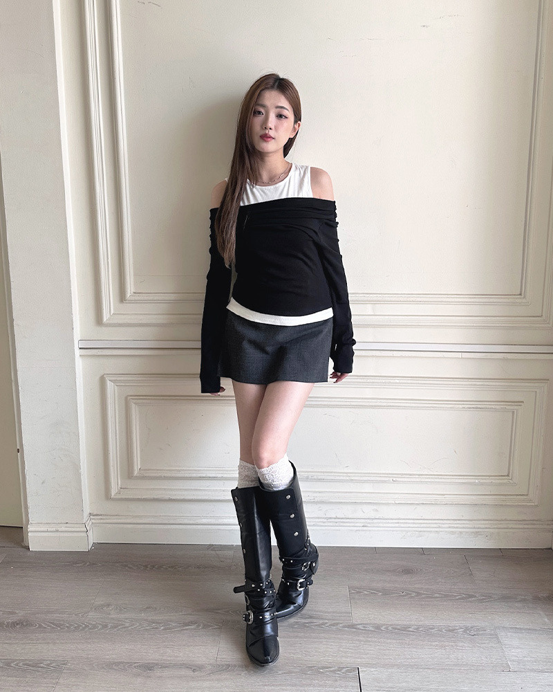 PURPLE-純粹白灰 韓系假兩件一字領上衣*2色