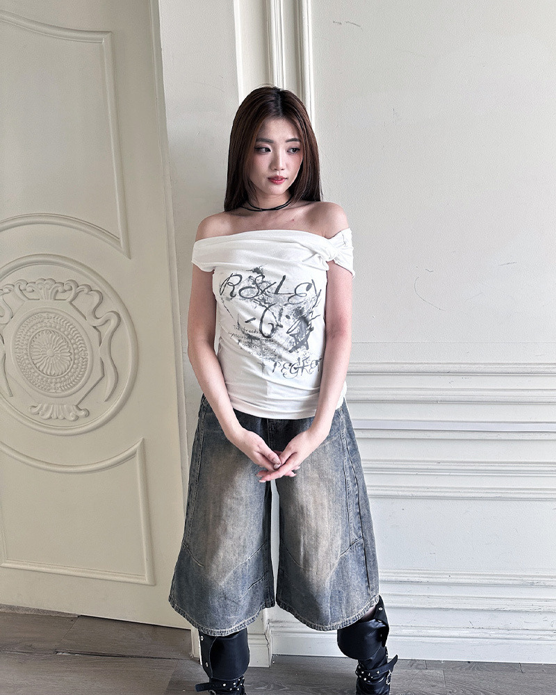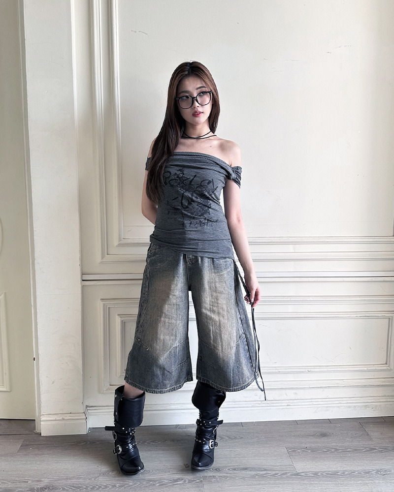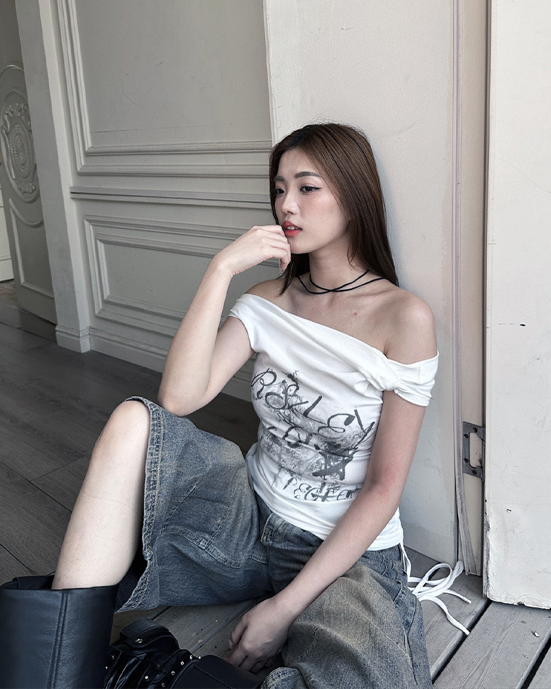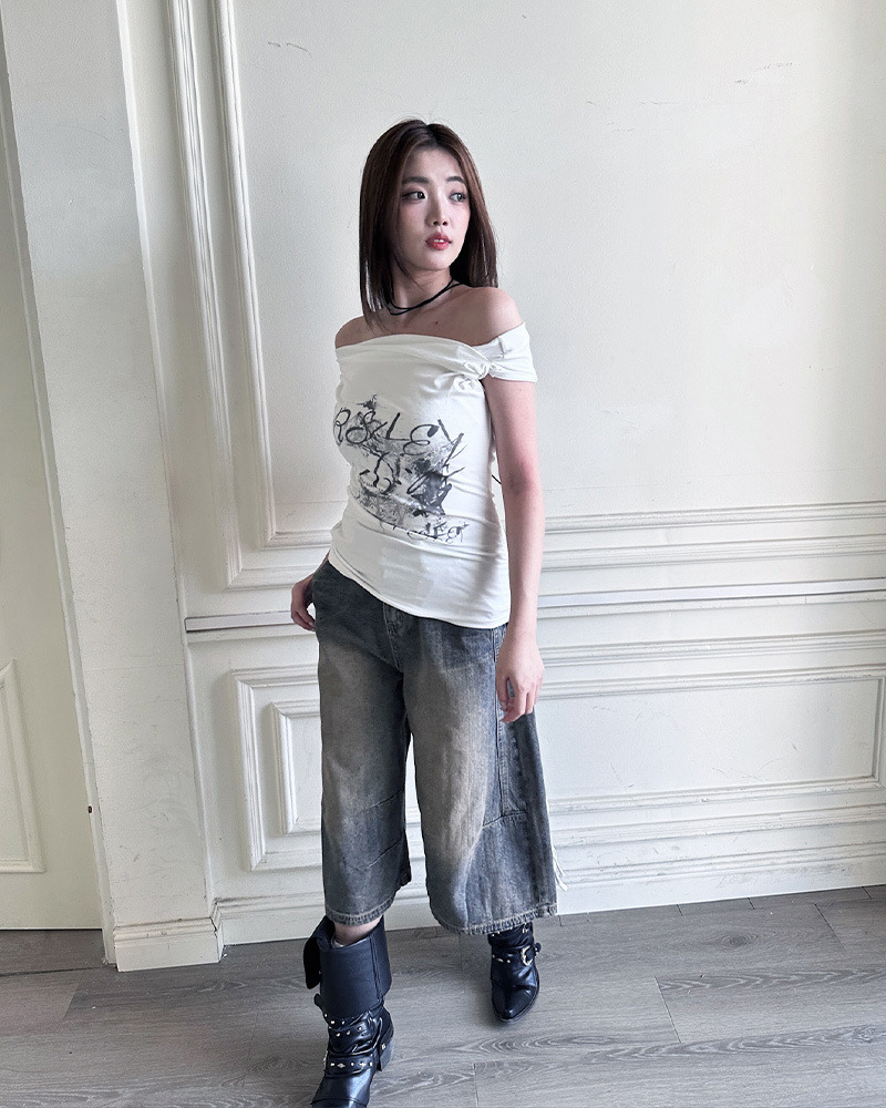 PURPLE-Rock Star 一字領短版側抓皺上衣*2色
