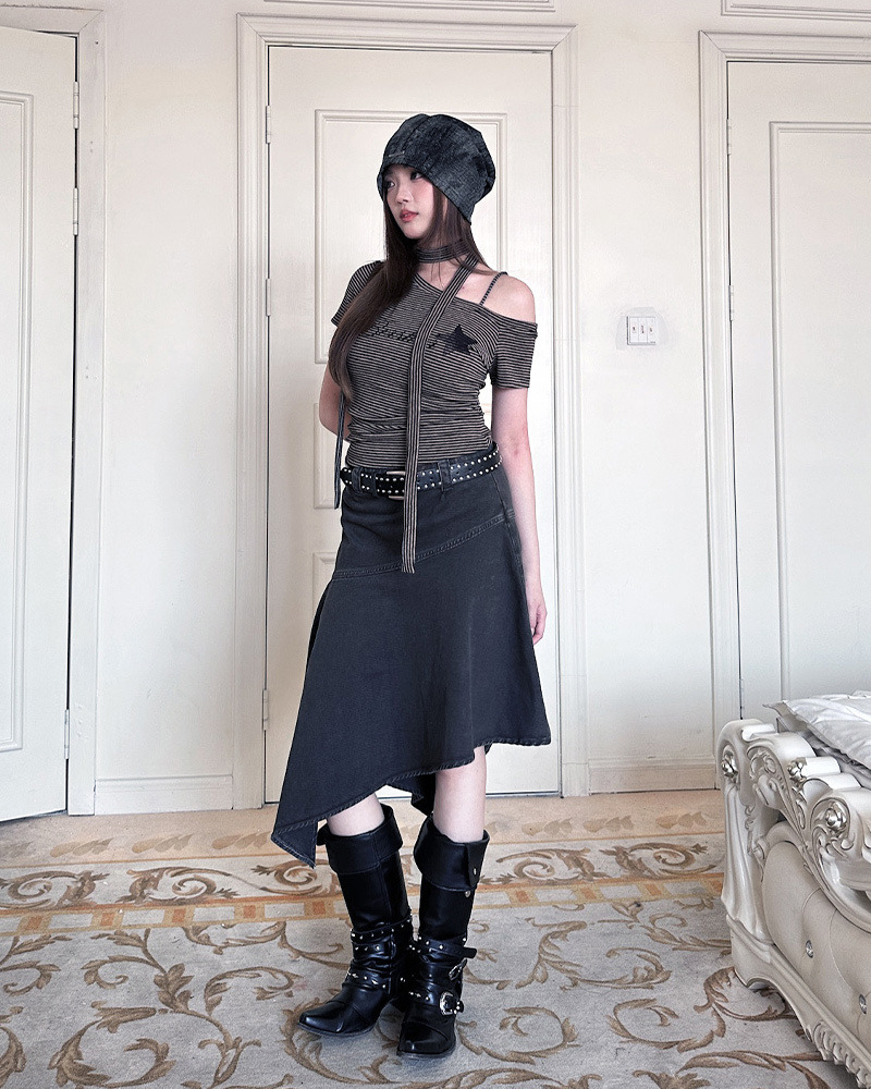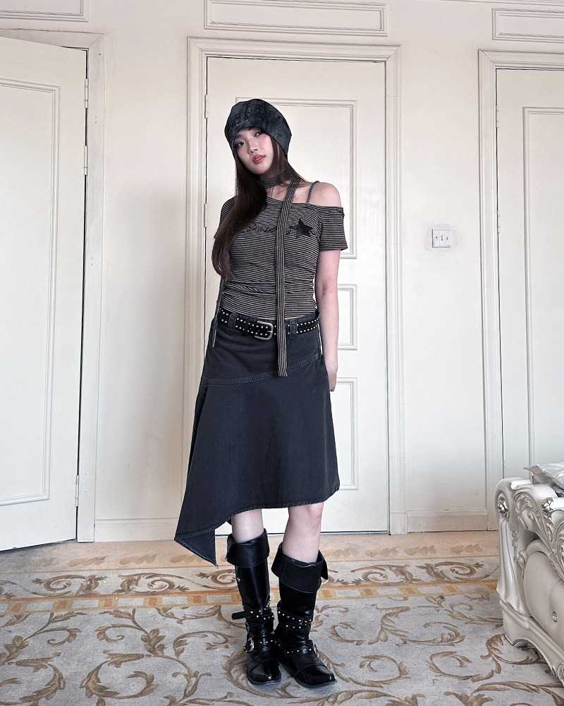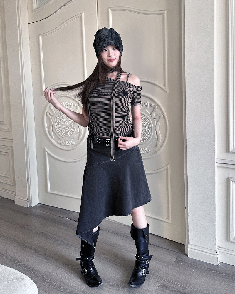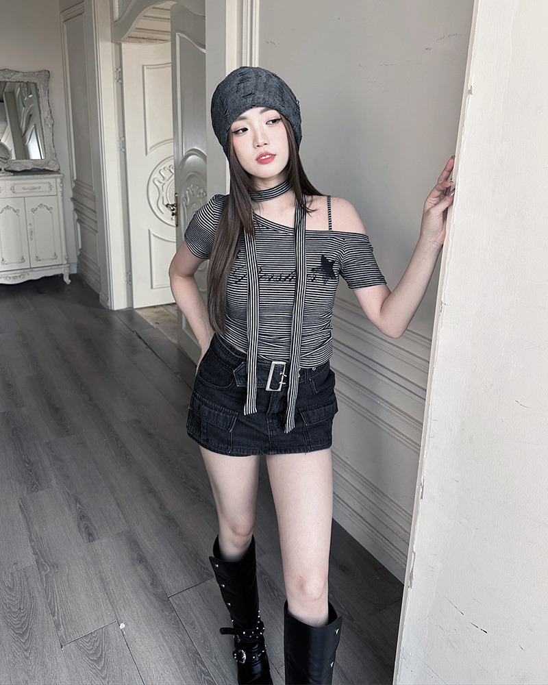 PURPLE-Y2K小辣 條紋綁帶斜肩上衣*2色